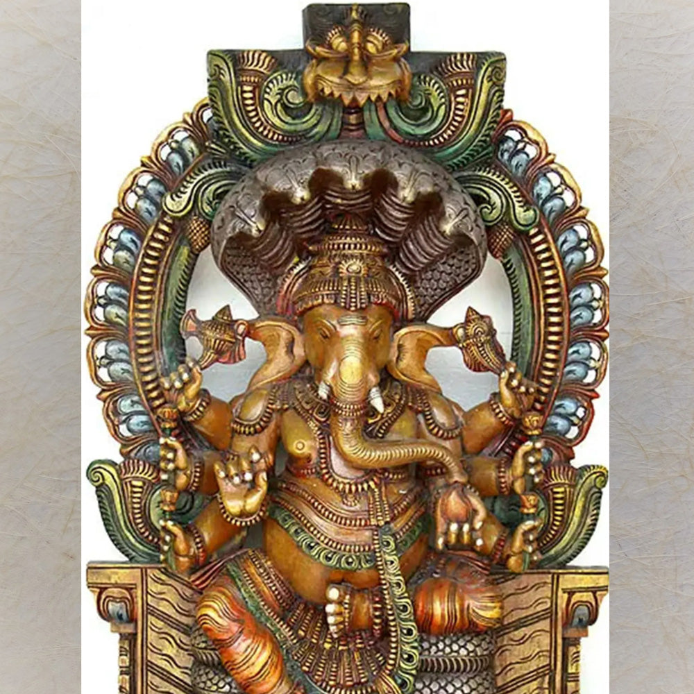 Description: This exquisite Ashtabhuj Lord Ganesha statue is handcrafted with precision and elegance, featuring the deity seated on a magnificent Kirtimukha throne. Made from high-quality Vaagai wood, the statue showcases the intricate beauty of Lord Ganesha's eight arms and detailed craftsmanship. With vibrant colors and an opulent finish, this statue symbolizes prosperity, wisdom, and success. A perfect addition to your home or office to invite blessings and positive energy. The statue features Lord Ganesha seated on the Kirtimukha throne, symbolizing divine power and protection. His eight arms, adorned with symbolic items, radiate energy, while the throne adds an extra layer of spiritual depth.