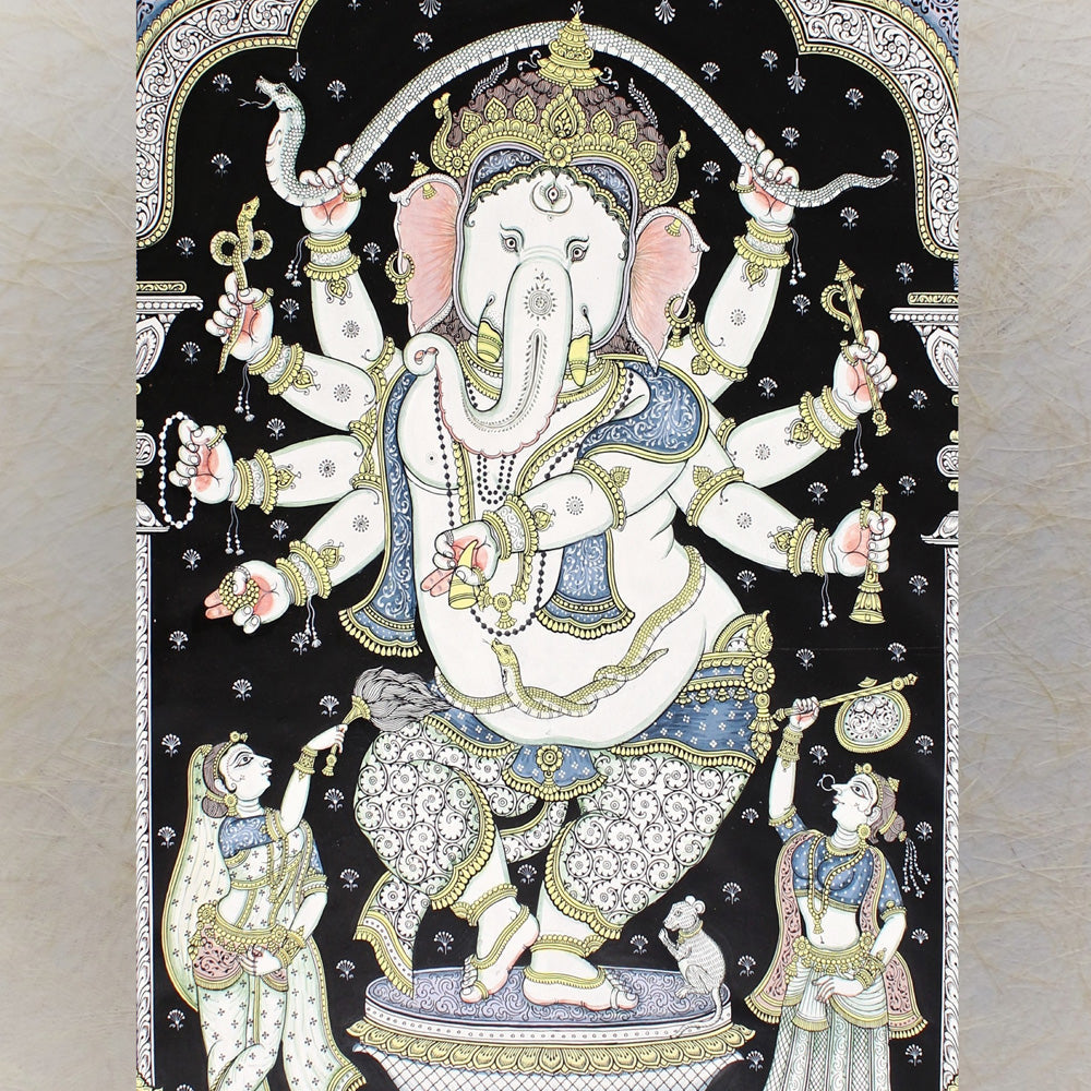 Description: Bring home the divine charm of Lord Ganesha with this exquisite Dancing Ganesha Pattachitra painting. Handcrafted by skilled artisans, this traditional artwork embodies cultural heritage and artistic finesse. The intricate details and vibrant colors make it a perfect addition to your home decor or as a thoughtful gift for special occasions. This painting showcases Lord Ganesha in a dancing pose, symbolizing joy, prosperity, and creativity. Adorned with intricate patterns, the artwork is set against a classic black backdrop, framed by traditional temple-style arches, evoking spiritual and aesthetic beauty.