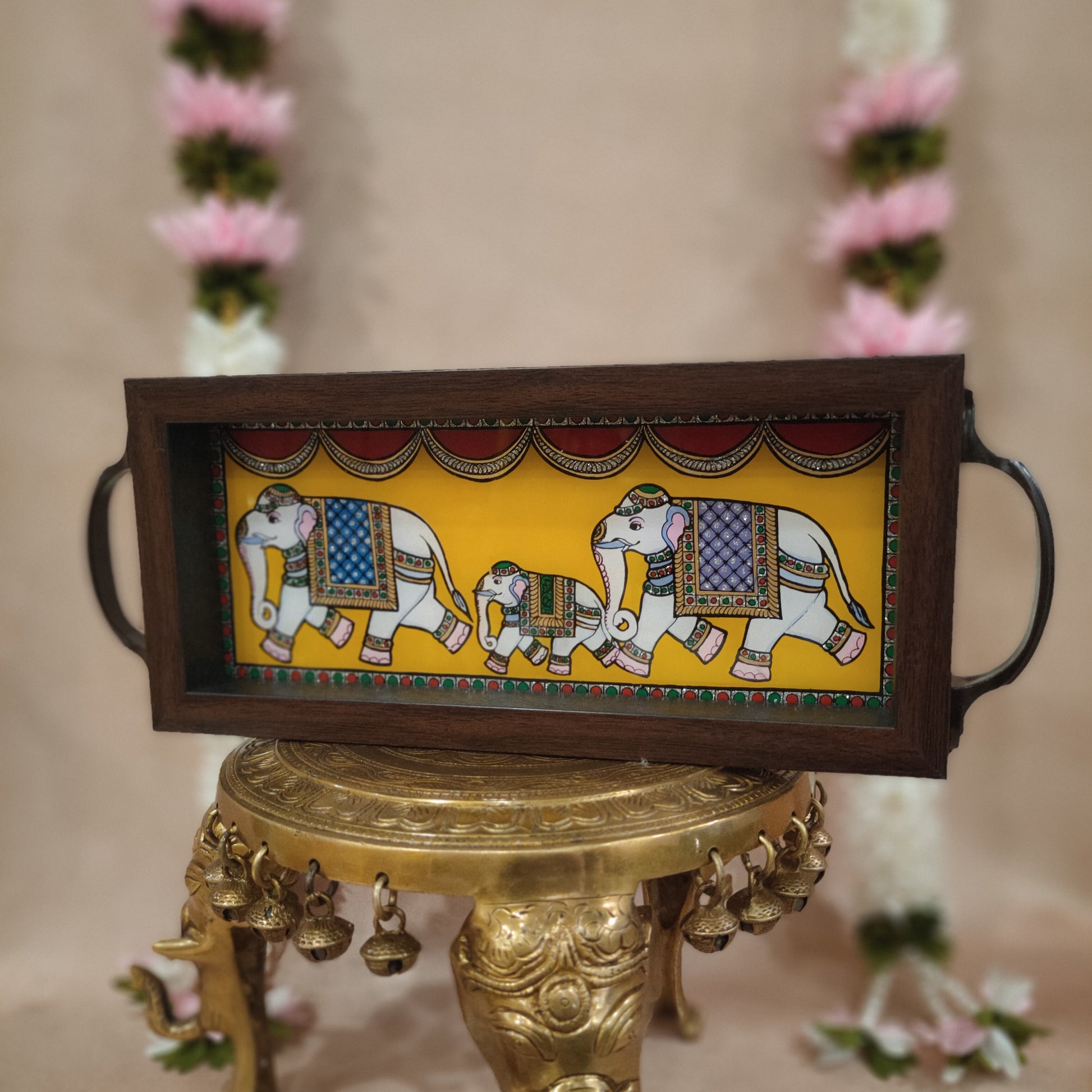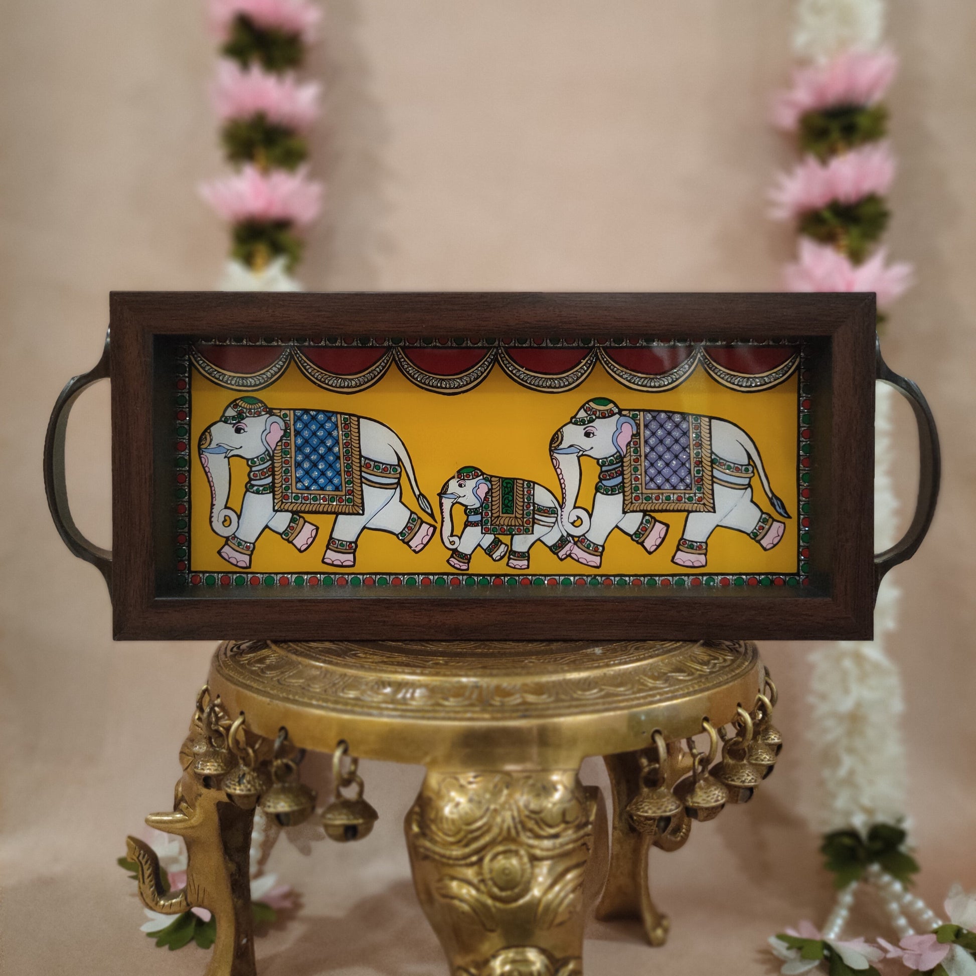 Description: The stunning Kalamkari style motif elevates this tray, making it a piece of classical art. The bright colors and intricate brushwork make this utilitarian item a beautiful decor piece. This is a great table Decor accent piece and also a perfect pick for use in a traditional gift hamper or simply gift it on it own.
