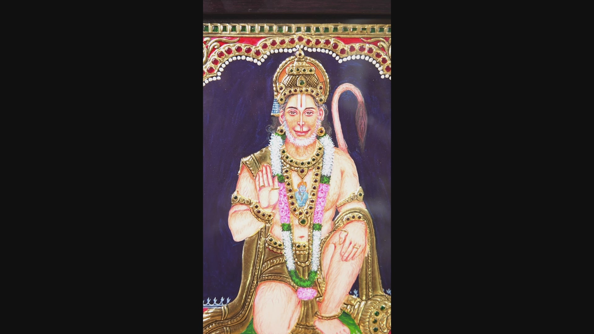 Description: This seated Hanuman is an outstanding example of the dexterity of the Tanjore artist and the high level of attention to detail in this art form. Notice Hanuman’s benign expression, the image of his beloved Rama he carries in his hear, and the texture and shading of the skin tones. Hard to believe that the artist has packed so much in a composition that is just 10 x 8 inches in size!