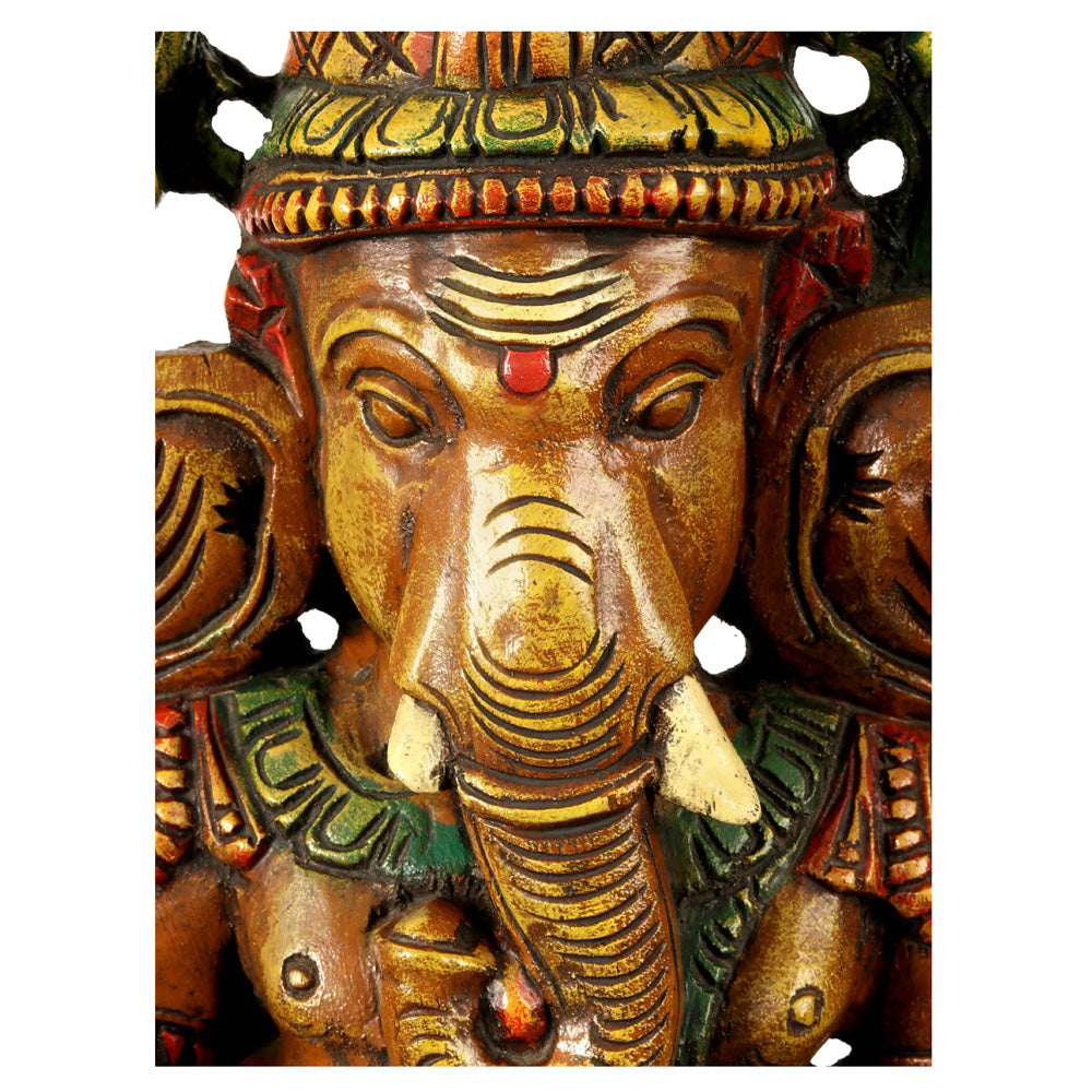 Description: This stunning Lotus-Seated Ganesha statue, enshrined with a prabhavali, is a true work of art. Handcrafted from high-quality wood and featuring vibrant colors, this statue depicts Lord Ganesha seated on a lotus with intricate detailing of the surrounding prabhavali (a halo-like structure). The design captures Lord Ganesha's divine grace, making it a perfect symbol of prosperity, wisdom, and blessings. Ideal for home decor, temples, or gifting on special occasions. Lord Ganesha is depicted seated on a lotus, holding traditional items while surrounded by a beautifully carved prabhavali. The vibrant colors of the statue, along with the fine detailing, create a regal and divine presence