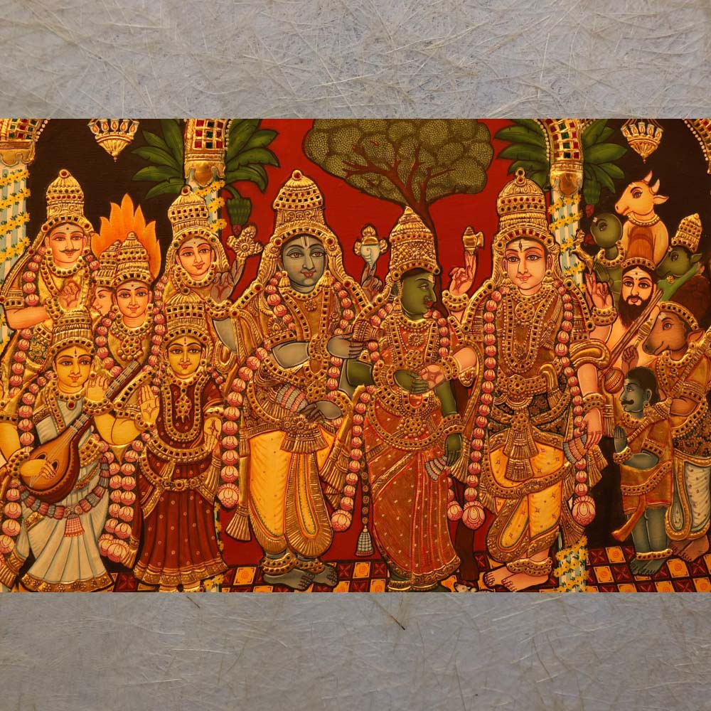 Description: Celebrate one of the most sacred and grand divine weddings in Hindu tradition with this exquisite 3D-style Tanjore painting of Meenakshi Kalyanam. Featuring Goddess Meenakshi and Lord Sundareswarar (Shiva) in their celestial wedding ceremony, this artwork includes deities, celestial beings, musicians, and attendants — all brought to life with a rich sense of dimension and depth. Carefully handcrafted by South Indian artisans, the painting captures the magnificence of the Madurai temple tradition with layered textures and intricate detailing. This is a statement piece ideal for pooja rooms, living areas, and temple spaces. With frame - 54x78 Without frame- 48x72