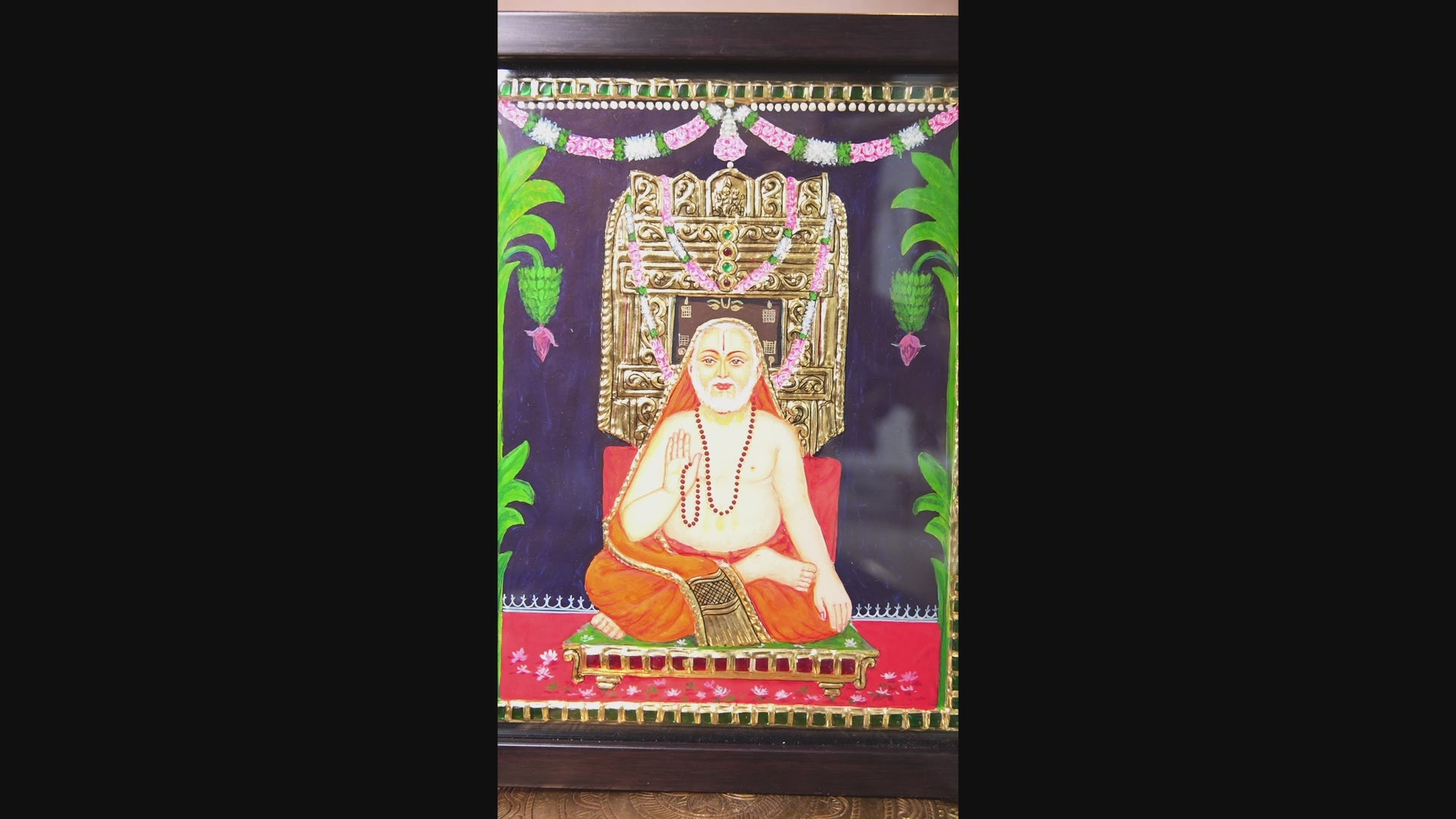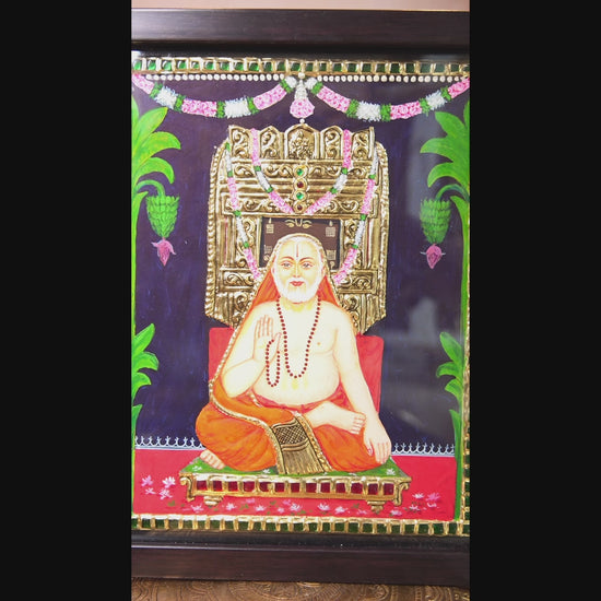 Description: This charming 10 x 8inch Tanjore painting of Sri Raghvendra Guru is an excellent example of the our smaller-sized Tanjore paintings. Of special note are the facial features and aura of gentle calm that the artist has been able to capture even in such a small canvas. The dexterity and skill of the artist are truly commendable!