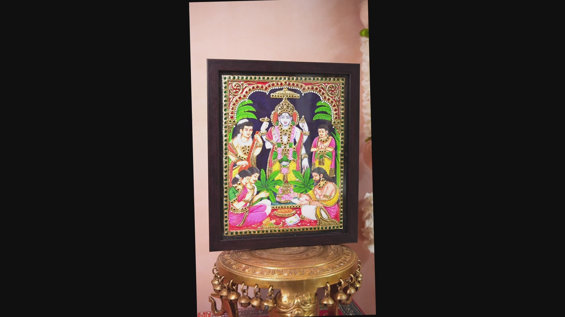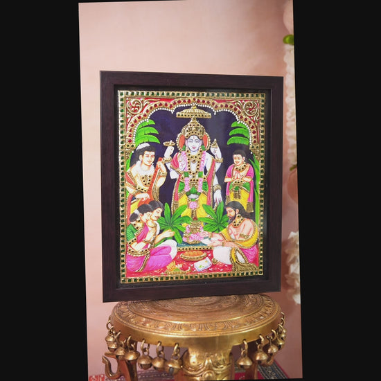 Description: The Satyanarayana Vratham is a theme not seen commonly in traditional Tanjore paintings. Even in this painting of just 10 x 8 inches, the artist has created a composition that is so detailed and proportionate. Of special note are the facial features and the subtle shading of skin tones.