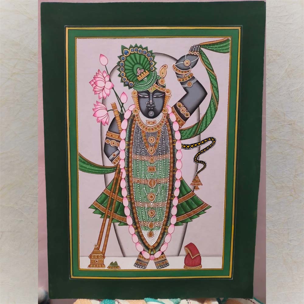 Description: Introduce celestial beauty and royal elegance to your favorite space with this exquisite handcrafted Pichwai painting of Shrinathji of Nathdwara, bursting with intricacy and vibrant color. Based on the artisanal tradition of temple paintings from Nathdwara, the painting depicts Lord Krishna in his characteristic black form wearing lush green garments, pink lotus flowers, and beautiful jewelry reflecting rich devotional artistry.Every aspect of the painting, including the delicate lotus flowers and intricate dotted jewelry, has been hand-painted by talented artisans, making this not only a perennial Decor piece of religious significance but also a great collectible piece of Pichwai art. With frame - 18X22 Without frame- 14x18
