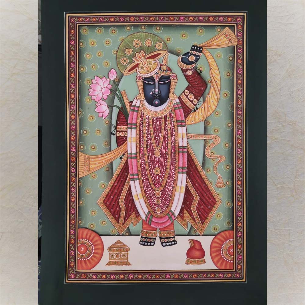 Description: Experience sacred art and storytelling by way of this beautiful hand-painted Pichwai of Shrinathji that draws inspiration from the temple art of Nathdwara. Lord Krishna is shown in his true form and majesty, as he holds aloft Mount Govardhan with complete ease, implying divine strength and protection. The deity is adorned for the representation in emerald-green clothing and adorned with lotus flowers and sacred ornaments of decoration. This artwork depicts an alluring spiritual charm that is timely and delightful.This artwork satisfies the cognitive function of prayer or devotion, while also serving as a potential to be a collector's item. The artwork will last as decor or a devotional outreach for many years. With frame - 18X22 Without frame- 14x18