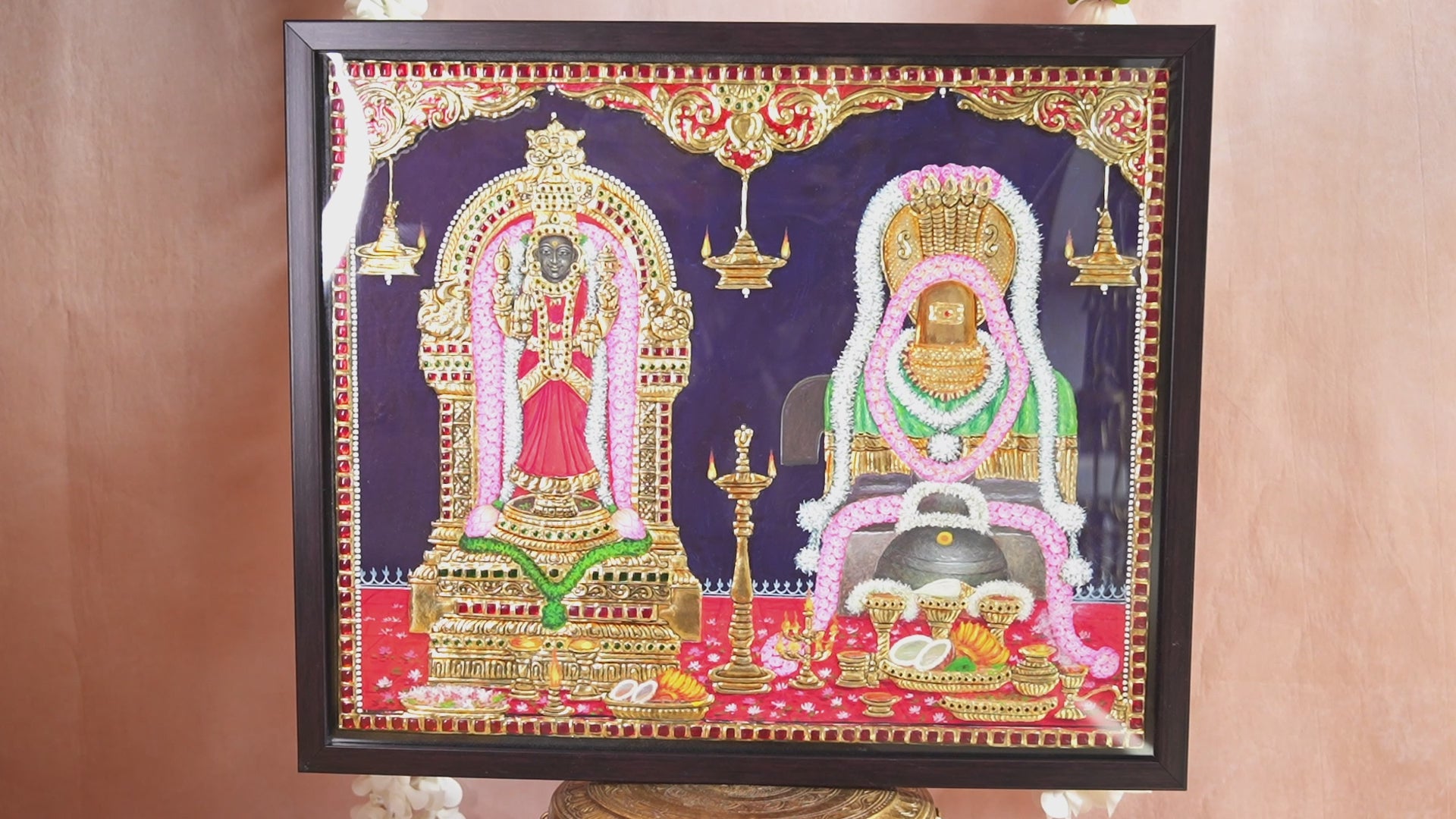 Description: Vaitheeswarankoil, is the eponymous town where Shiva as Vaitheeswaran and Parvathi as Thaiyalnayagi are worshipped. This composition depicts the idols of these deities as seen in the temple. Vaitheeswaran is an understanded but equally beautifully finished lingam, adorned by skilfully painted garlands. The pooja utensils and offerings, lamps, and the gorgeous red and gold mandapam in which the deities stand add so much beauty and grandeur to this composition.